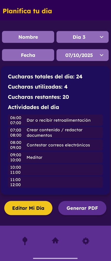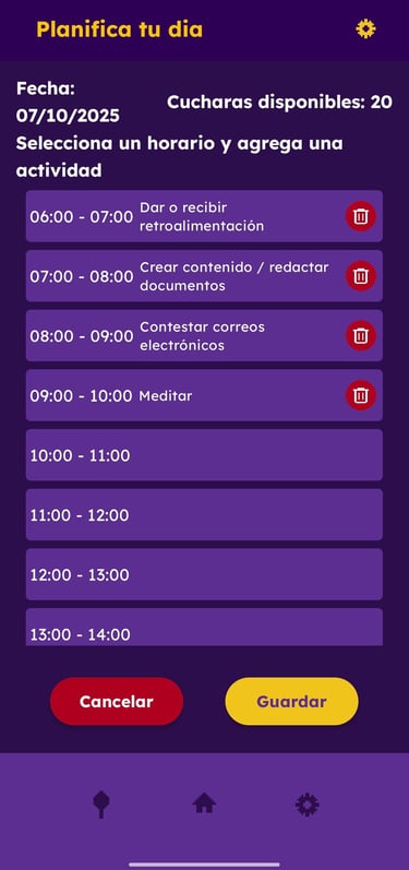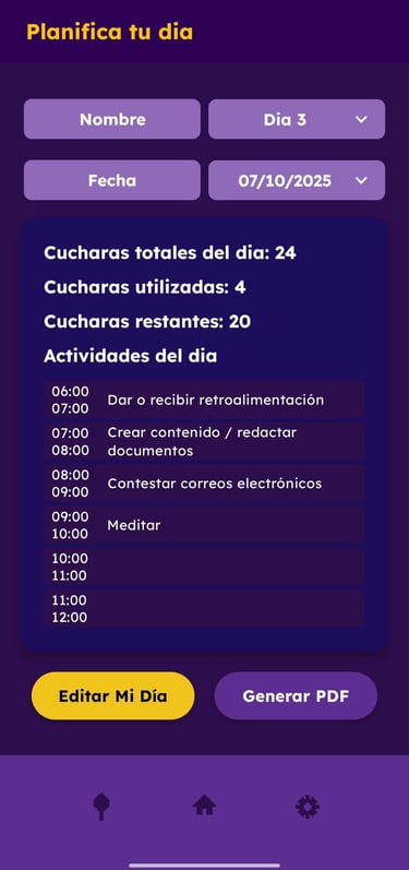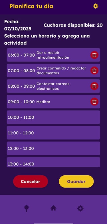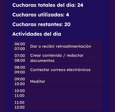 Veras las actividades y cuantas cucharas restantes tienes disponible. Recuerda guardar tu planificación.